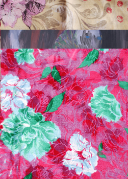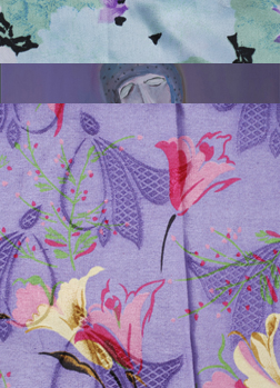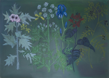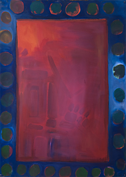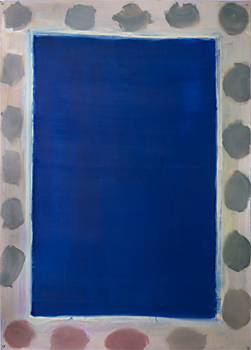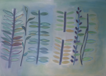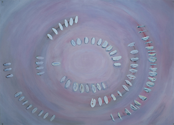 Ranger les couteaux et voir dormir le sable, installation et action, Line Clément 7 peintures 122 x 92 cm + tissus (extraites d'une installation) 1993